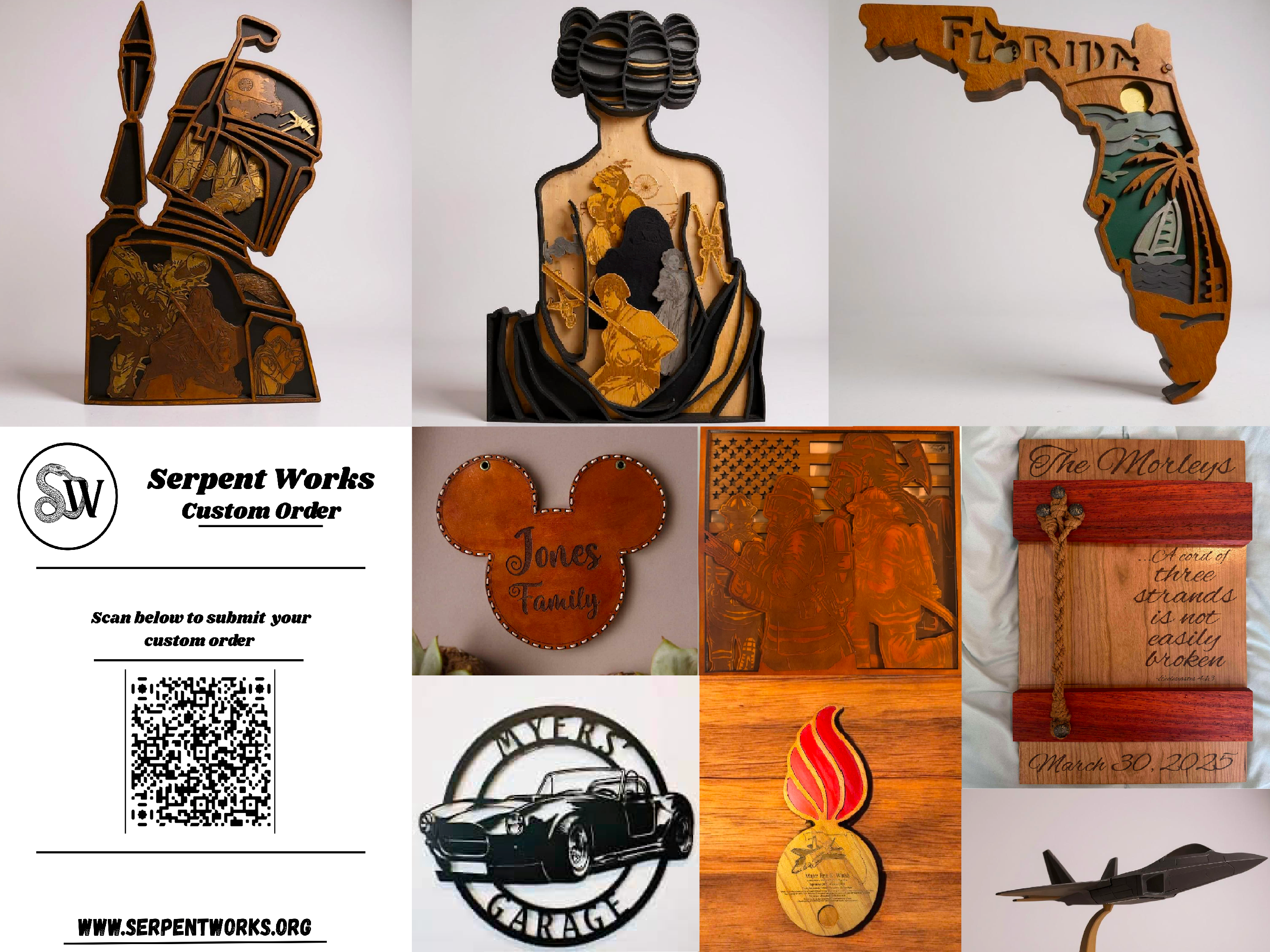 Starting with custom wood and metal plaques, awards, and gifts, Serpent Works has expanded to specialize in leather, wood, metal, 3D modeling, printing, and more. We are veteran owned, and love creating and brining ideas to life